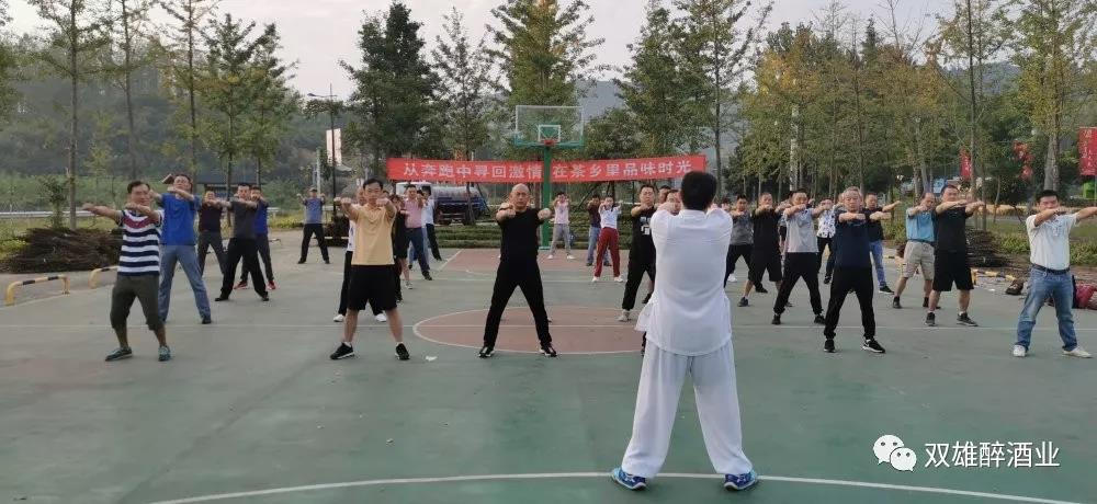 8日清晨,大家在玉皇劍莊園前的籃球場上,在鄭總帶領(lǐng)下,一起練習武當養(yǎng)生功,初秋,涼風習習,空氣清新,大家吐納開合,一招一式透出力量與精神,功課練完,汗?jié)褚陆?,無不覺得神清氣爽。鄭總說,各位老板每日應(yīng)酬很多,多年來嚴重透支身體健康,練養(yǎng)生功的目的就是要提高我們身體的自愈修復(fù)功能,練功要堅持才能達到效果,雙雄醉健康酒業(yè)不僅為大家提供健康的白酒,還要倡導(dǎo)健康的生活方式。