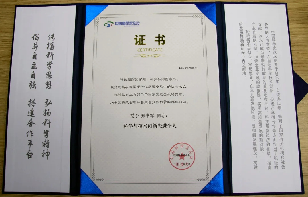鄭書軍總的研究成果獲得中國科學家論壇專家團隊的高度重視,特為鄭總頒發(fā)了科學與技術創(chuàng)新先進個人證書和獎牌。