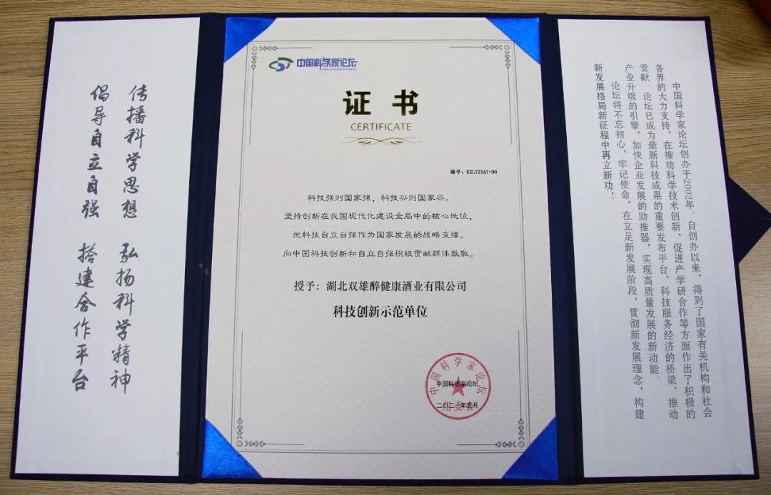 2020年底,總經(jīng)理鄭書軍撰寫的《淺論新時期傳統(tǒng)白酒面臨的挑戰(zhàn)與健康白酒的發(fā)展方向——兼談湖北雙雄醉健康酒業(yè)的探索與實踐——》論文在國內(nèi)多家專業(yè)刊物發(fā)表,并被翻譯成英文在國外媒體廣為傳播,引發(fā)國外同行關(guān)注,論文從中國白酒發(fā)展簡史簡述,講到白酒與生命健康之間的關(guān)系,再到白酒對人體精神能量的影響,探索新時期白酒突圍的方向,落實到雙雄醉健康酒業(yè)對健康白酒的探索與實踐。用相對通俗的科普方式幫助消費者了解白酒的起源、白酒的健康因子、怎樣適度飲用等基本常識,向世界推薦中國,推廣中國文化和健康飲品。中國科學(xué)家論壇授予了雙雄醉健康酒業(yè)總經(jīng)理鄭書軍,“中國科學(xué)家論壇科學(xué)與技術(shù)創(chuàng)新先進個人”的表彰并頒發(fā)了獎牌和榮譽證書。