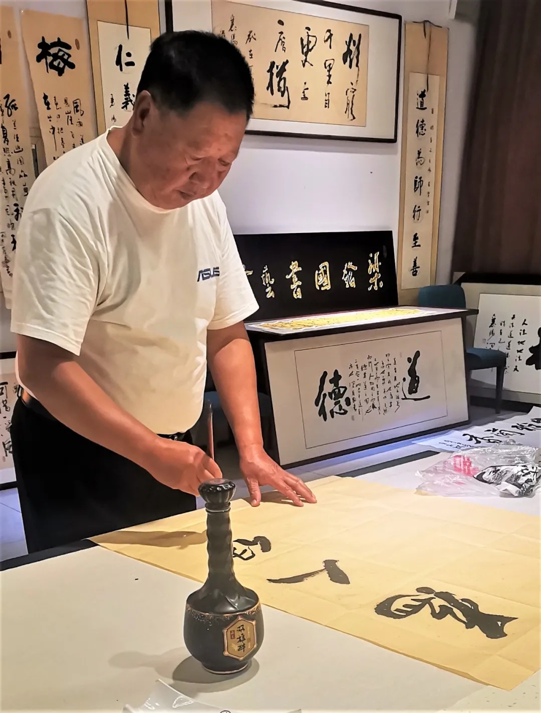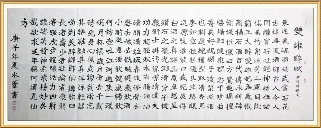 雙雄醉樊城區(qū)域經(jīng)理王謙表示,書法與白酒,都是中華燦爛文明的傳承,石花酒與書法界淵源頗深,“霸王醉”三個(gè)字是由一位谷城書法家所書,雙雄醉品牌確立之時(shí),品牌名稱就由襄陽書法家倪世偉所書。最近,由襄陽寫賦第一人黃耀輝撰寫、書法家倪世偉書寫的《雙雄醉賦》也閃耀亮相。