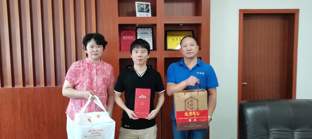 8月16日,在襄陽企聯(lián)常務(wù)副會長兼秘書長趙樂成帶領(lǐng)下,數(shù)據(jù)部部長劉輝、雙雄醉健康酒業(yè)大客戶服務(wù)部總監(jiān)李愛軍,來到湖北回天新材料股份有限公司,為湖北基地總經(jīng)理張亞、集團副總韓林贈送盛滿了關(guān)愛的愛心蛋糕、賀卡以及雙雄醉頂級酒——清罇優(yōu)醬。
