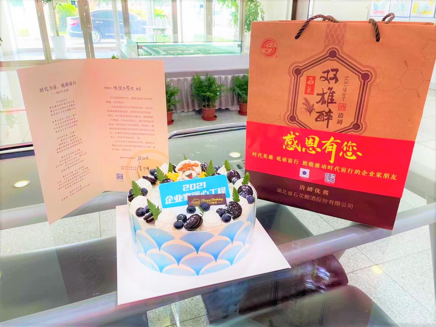 這是襄陽企聯(lián)和石花雙雄醉為襄陽優(yōu)秀企業(yè)家準備的生日禮物,為企業(yè)家朋友在過生日當天送上溫馨祝福,生日蛋糕、賀卡和雙雄醉頂級酒——清罇優(yōu)醬,感謝襄陽企業(yè)家為地方經(jīng)濟發(fā)展作出貢獻!