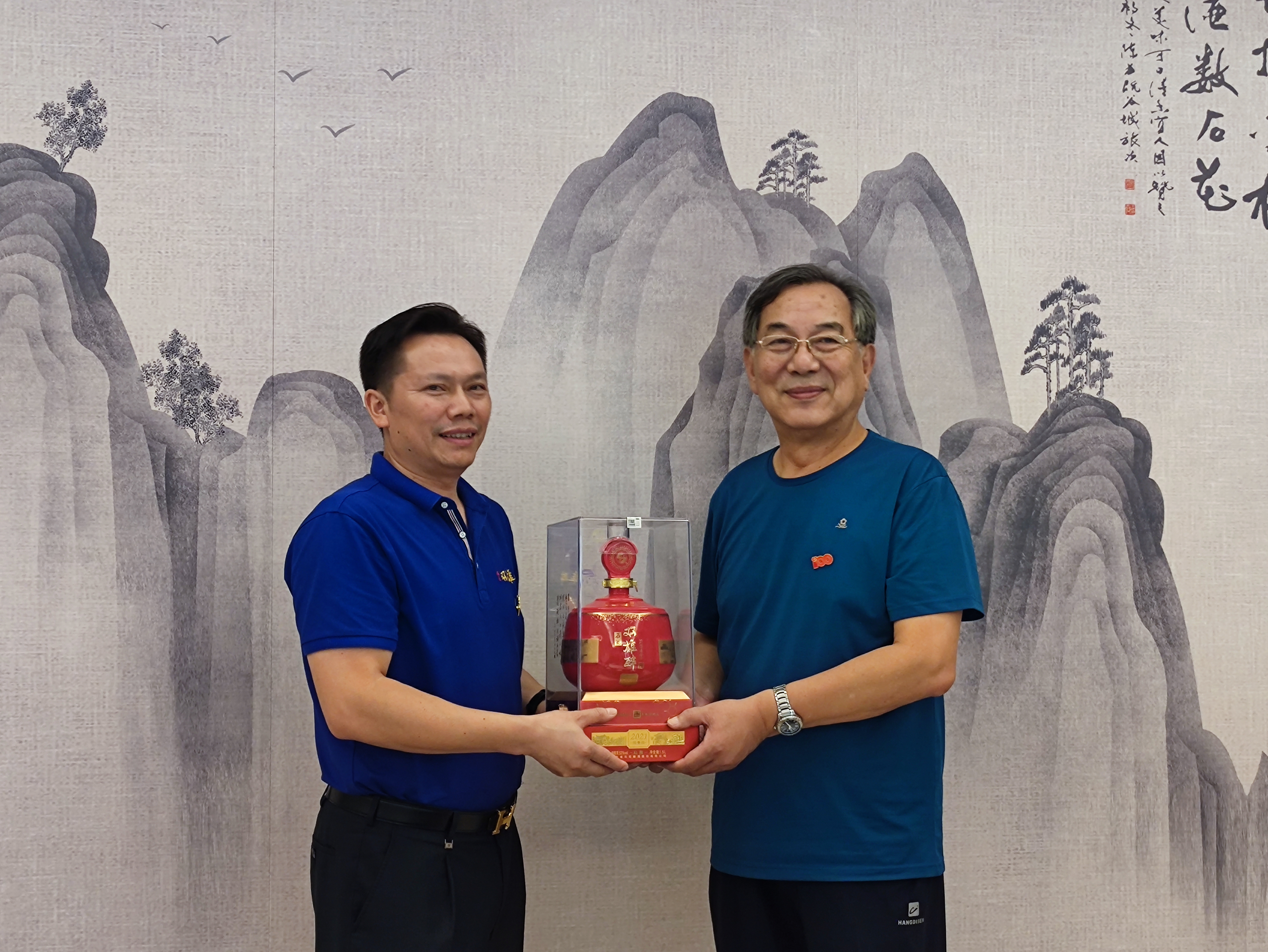 雙雄醉總經(jīng)理鄭書軍向畢老師贈(zèng)送雙雄醉2021限量版紀(jì)念酒