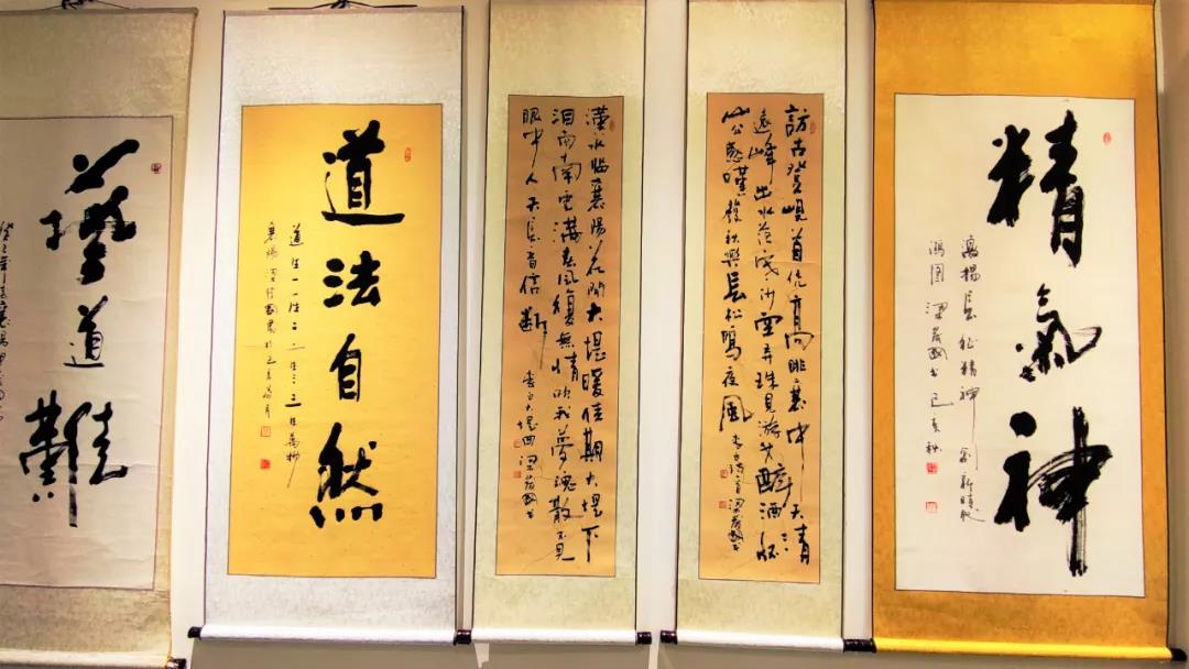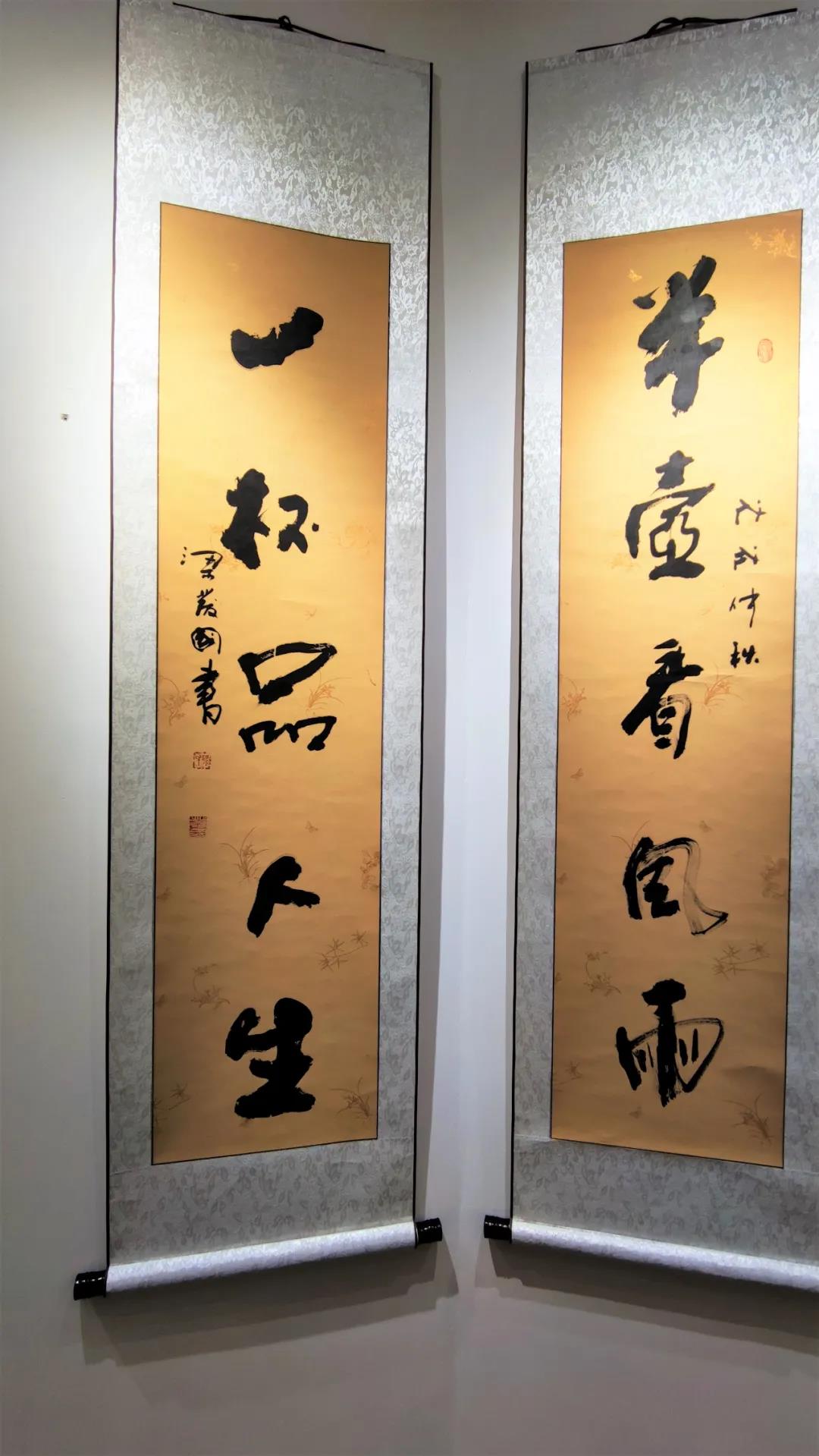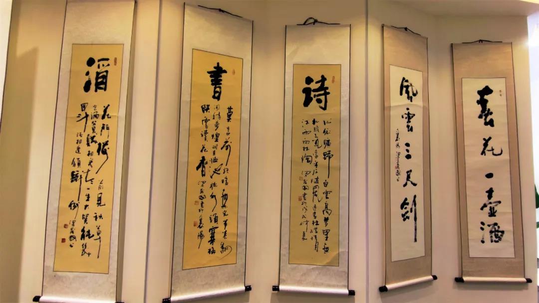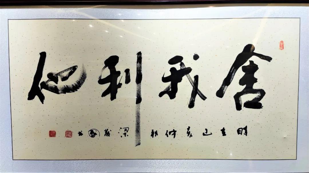 本次梁發(fā)國展出的書法作品一百多幅,作品題材豐富,主題鮮明,風格各異,構(gòu)思新巧。大字榜書雄健灑脫,勢如破竹;條幅行草清秀挺拔似高山流水,線條自然,飛白有度;小品則典雅秀美、別有韻味。觀整幅作品其情趣,理念,神韻,意境自然,悟道不盡,會賞不絕!