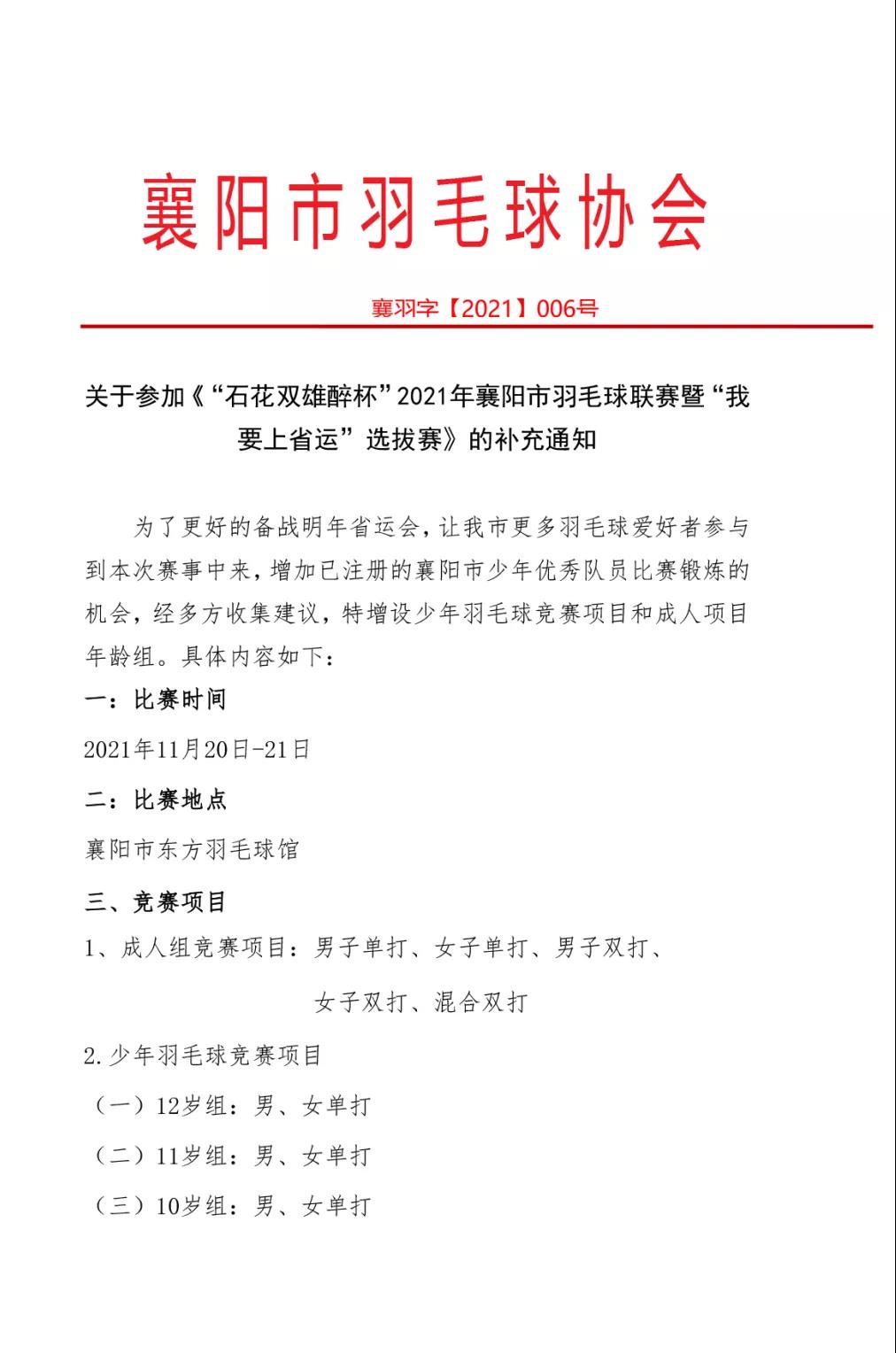 以下是《“雙雄醉杯”2021年襄陽市羽毛球聯(lián)賽暨“我要上省運(yùn)”選拔賽》的補(bǔ)充通知:
