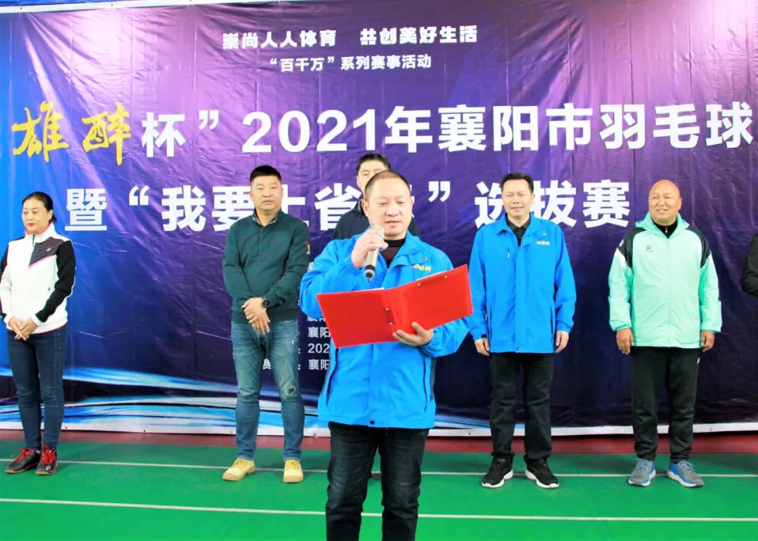 湖北雙雄醉大客戶服務(wù)部總監(jiān)李愛軍致辭,雙雄醉成立之初,便以“全民樂享健康生活新方式”為企業(yè)愿景和“共建、共生、共享”的經(jīng)營理念,兩年多來,公司不斷參與各種有益身心的健康活動。此次贊助2021年襄陽市羽毛球聯(lián)賽暨“我要上省運(yùn)”選拔賽,正是踐行公司愿景,號召全社會都能積極健身、提高身體素質(zhì),營造健康生活新方式社會氛圍的實(shí)際行動,石花雙雄醉愿意為提升襄陽人民的身體健康和幸福生活指數(shù)奉獻(xiàn)力量。