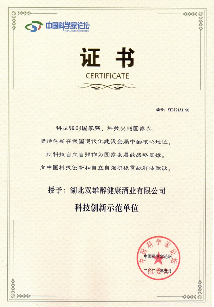 2021年5月22日,雙雄醉健康酒業(yè)被中國(guó)科學(xué)家論壇授予科技創(chuàng)新示范單位。中國(guó)科學(xué)家論壇是在著名科學(xué)家、時(shí)任全國(guó)人大常委會(huì)副委員長(zhǎng)、中國(guó)科協(xié)主席周光召院士特別關(guān)懷和支持下,于2002年創(chuàng)辦,已成功舉辦了18屆。十九年來,中國(guó)科學(xué)家論壇得到了科技部、中國(guó)科學(xué)院、中國(guó)工程院、中國(guó)科協(xié)、國(guó)家自然科學(xué)基金會(huì)、清華大學(xué)、北京大學(xué)等,以及社會(huì)各界的大力支持,作為我國(guó)科技界最有影響力的交流合作平臺(tái)之一。