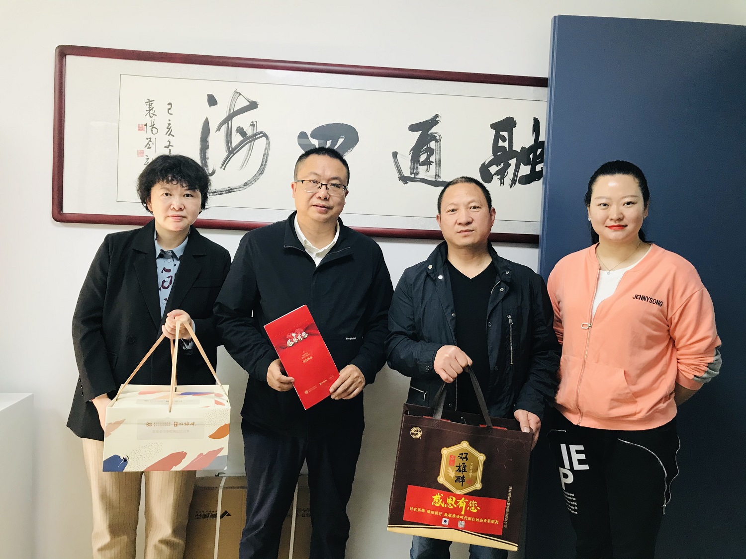 4月14日上午,襄陽市企業(yè)聯(lián)合會數(shù)據(jù)部部長劉輝、雙雄醉健康酒業(yè)大客服務(wù)部總監(jiān)李愛軍,帶著由市領(lǐng)導(dǎo)付勁松副市長、市經(jīng)信局楊富杰局長、市企聯(lián)吳少偉會長簽名的《襄陽英雄 青春永駐》生日賀卡和生日蛋糕以及石花雙雄醉含有SOD的醬酒——清醬,來到襄陽楚色傳媒科技有限公司,為過生日的楊勇總經(jīng)理送上生日禮物,并致以誠摯的生日祝福。