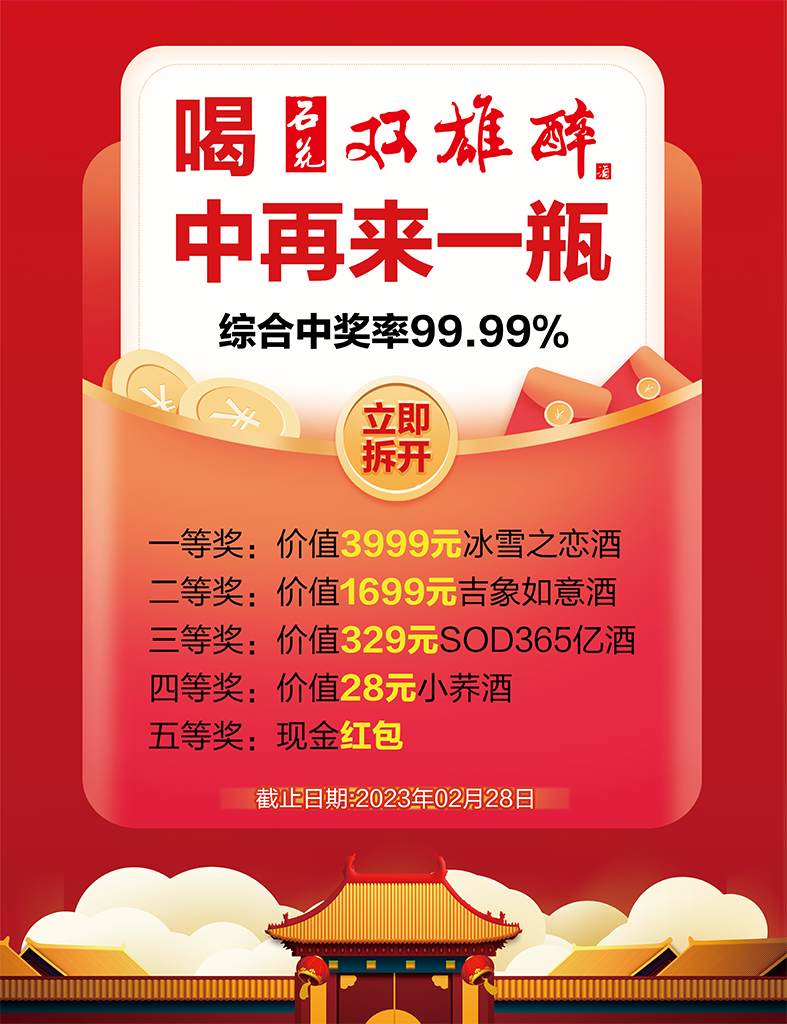 雙雄醉Q200億、Q300億、Q500億、365億帶獎(jiǎng)產(chǎn)品,瓶瓶有獎(jiǎng),中獎(jiǎng)率100%。中秋團(tuán)圓,帶一箱雙雄醉帶獎(jiǎng)產(chǎn)品,大家一起掃一掃,中驚喜,得好運(yùn),收獲一份又一份驚喜和好運(yùn)!